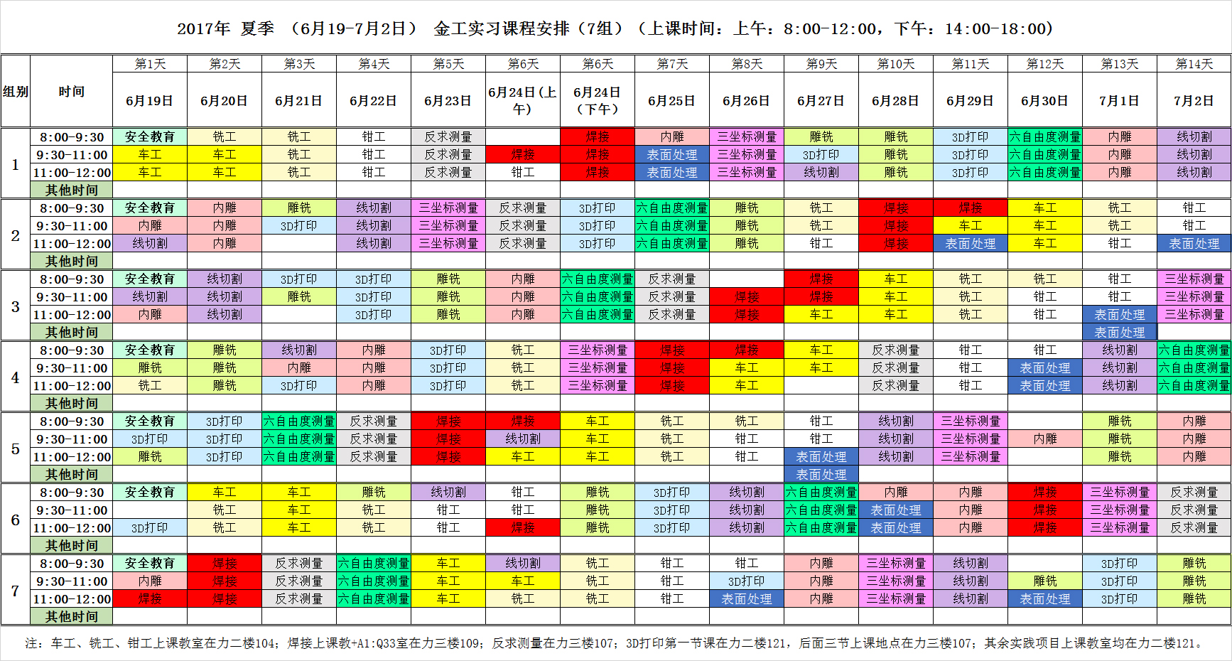 2017年夏季(6月19-7月2日)金工实习课程安排(7组)