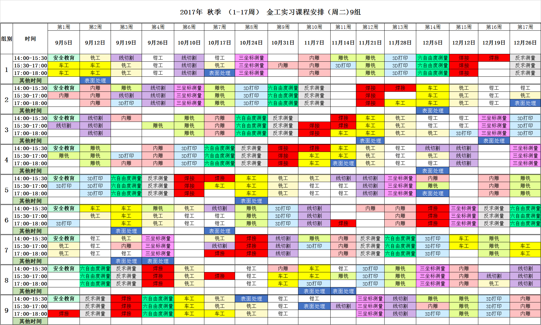 2017年秋季(1-17周)金工实习课程安排(周二)9组