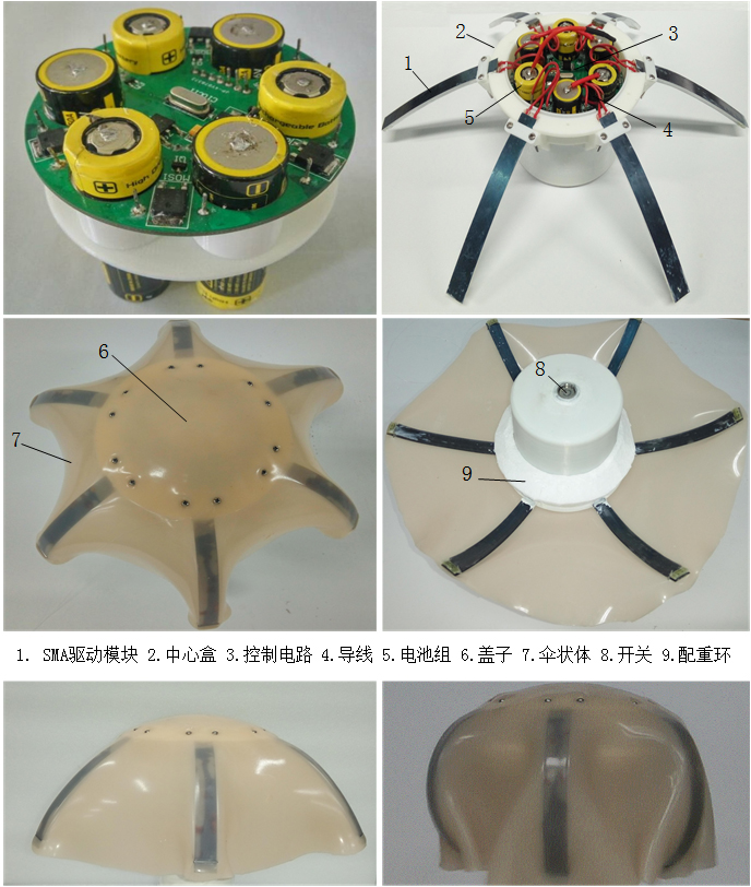 该仿生水母机器人由驱动器模块、内部电路模块、外部结构模块三部分组成。经团队合作成功设计了驱动器模块以及外部结构模块后,主要对内部电路模块进行验证以及扩展功能的尝试。经过两个月的设计制造,生产了第一台物理样机,并对其进行了试验,从而验证了系统的可靠性、实用性以及可行性。