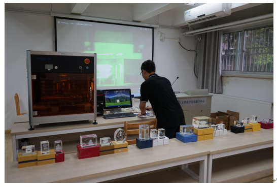 进入激光内雕展区,志愿者们正在准备着对这项技术的讲解,他们希望用简单易懂的语言,向嘉宾们展示各类先进的实验设备、种种神奇的前沿技术。为了引起嘉宾们的兴趣,他们特别准备了一些精美的内雕作品,摆件内精致逼真的建筑、丰神栩栩的人像、娇艳欲滴的玫瑰,显得晶莹剔透,让人忍不住流连驻足。他们希望嘉宾们不仅能够收获科学知识,更能从亲眼见证的激光内雕制作过程中加深对这项技术的理解,了解先进制造技术背后的奥秘。