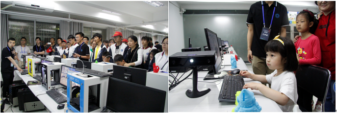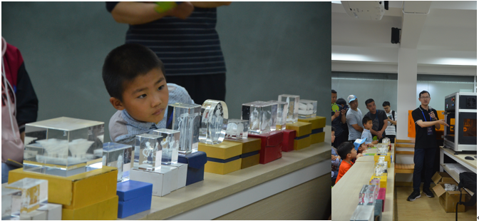 离开激光内雕展点,大家便来到了三维扫描和3D打印展区。志愿者不仅为大家讲解了三维扫描的原理应用和3D打印的基本原理,还以时髦的CCG技术为例,讲到了这项现代技术的前景。现场的所有桌面打印机都在忙碌着,孩子们目不暇接,不想错过任何一个成品。