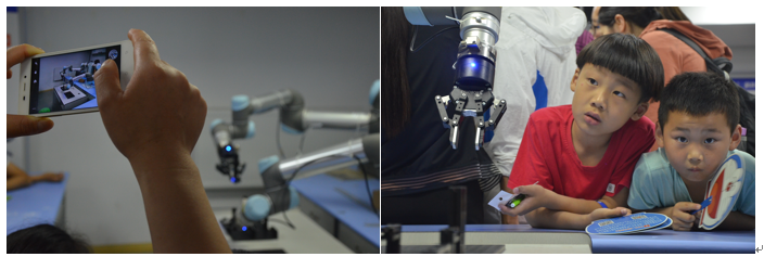 在志愿者们的引导下,大家接下来来到力二楼参观工业机器人。志愿者们为大家介绍了工业机器人的应用和当下面临的挑战,并带领孩子们观看了机械臂绘制科大校徽和组装零部件的过程。