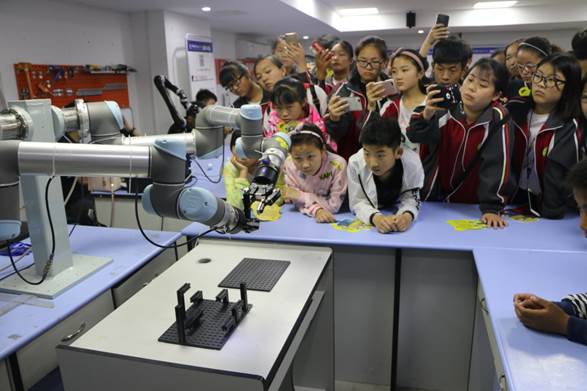 智能机器人展示厅里,“月球车”攀爬高难度的陡坡、 “RM比赛战车”的高速旋转、仿生机器人手臂准确操作等项目,无一不是引人注目,同学们纷纷举起手中的手机,记录下这令人激动的展示过程。直到参观结束,同学们仍是意犹未尽,驻足不肯离去,纷纷拿起相机和这些机器人合影留念。